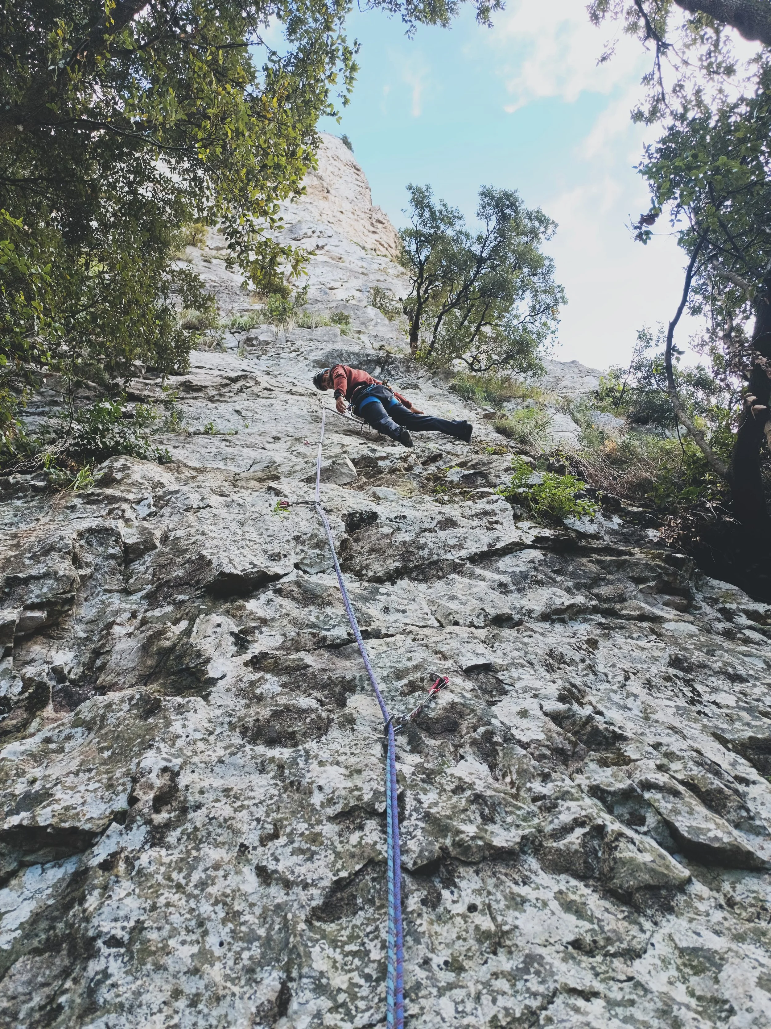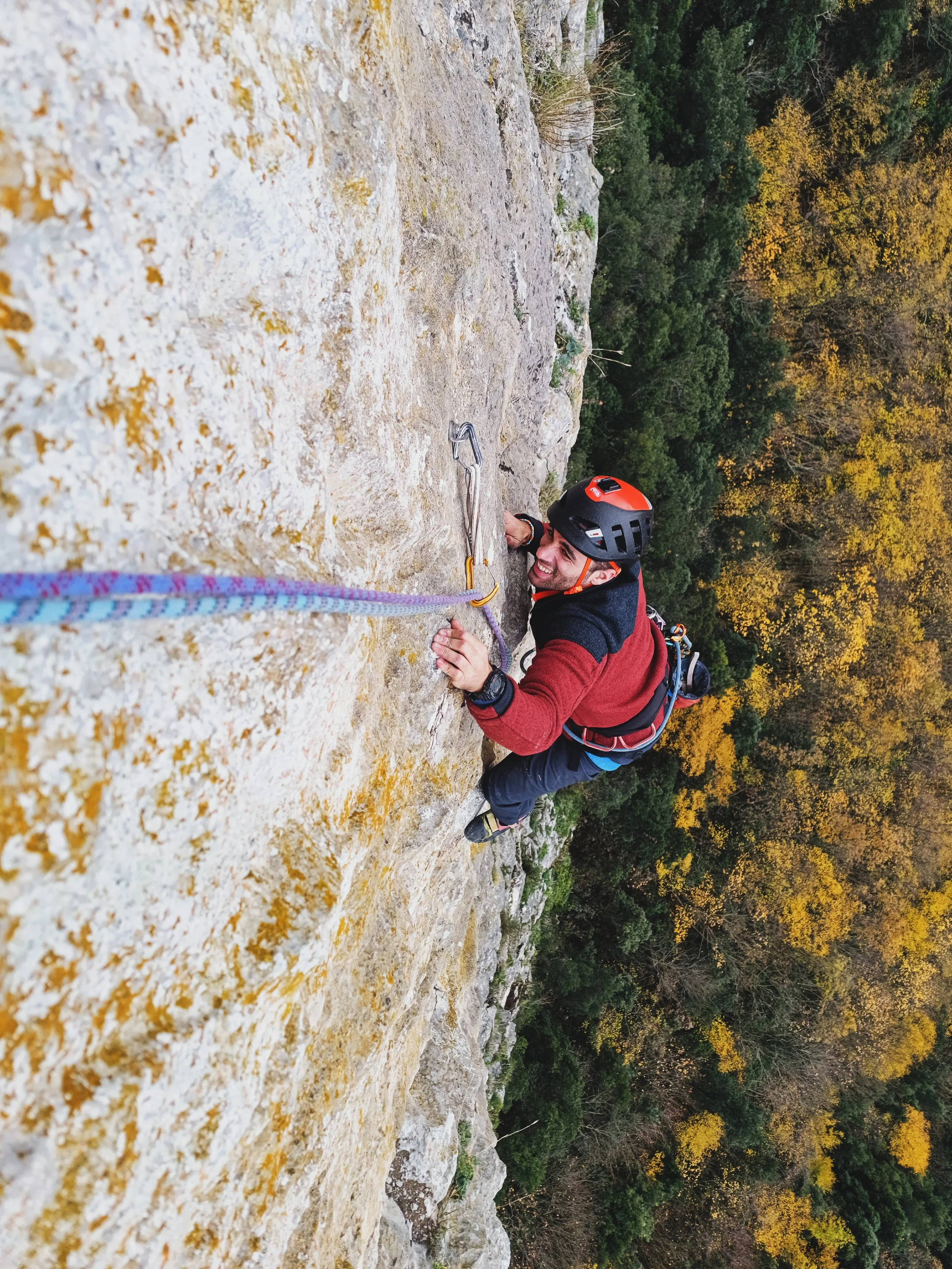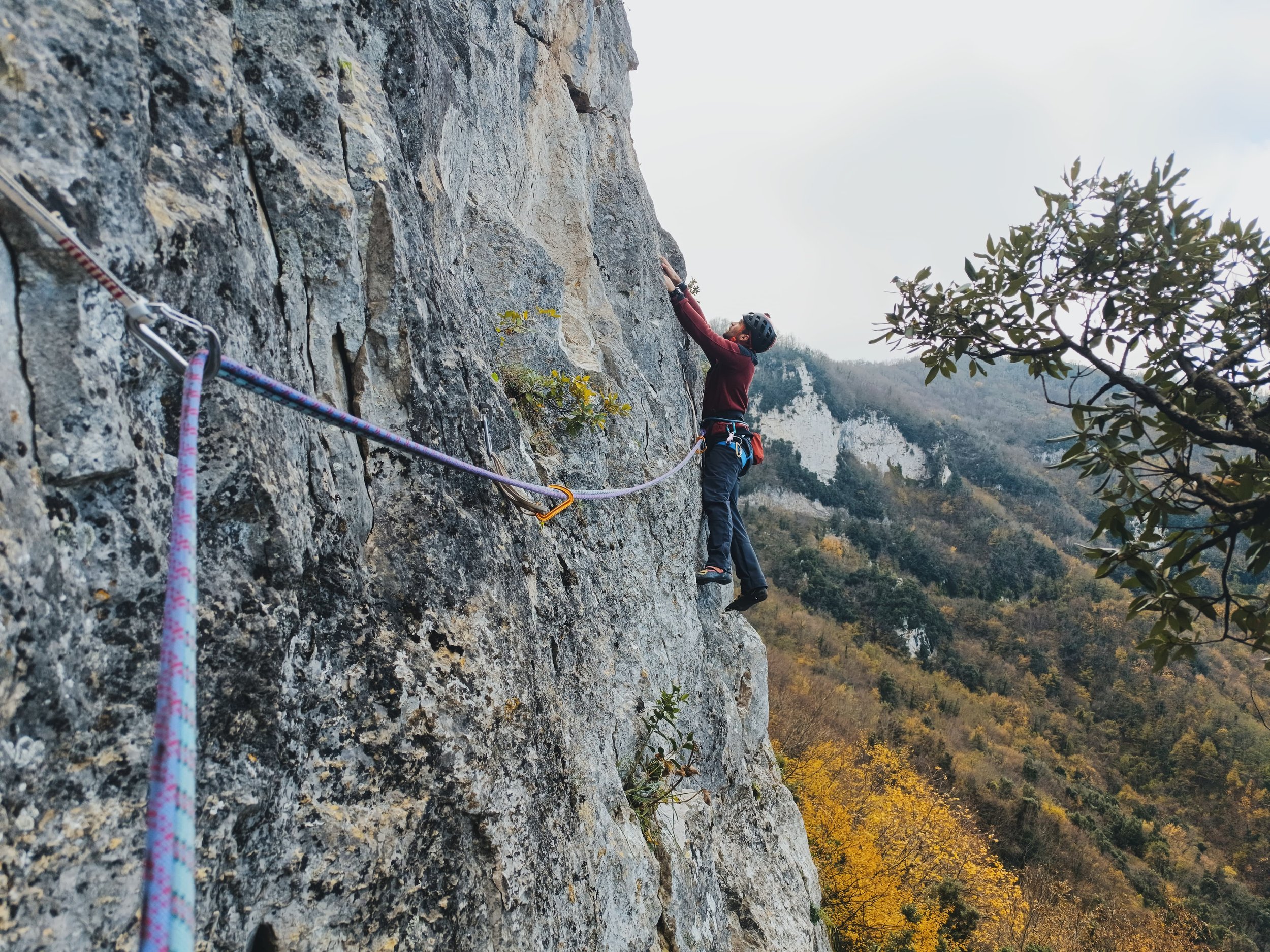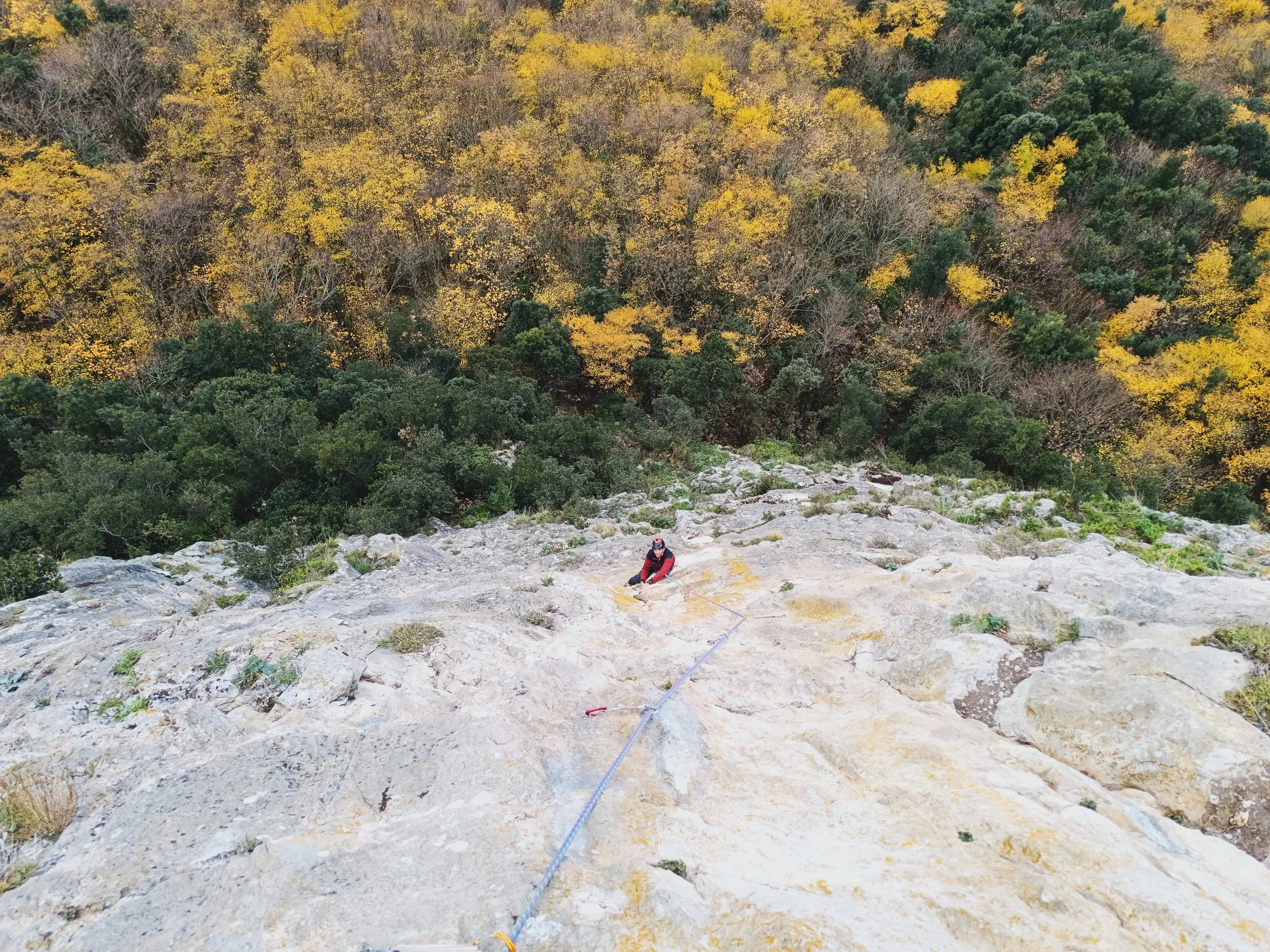 Discesa: Fino a L5 è possibile calarsi in doppia senza abbandonare materiale. Dalla cima si rientra a piedi per facile sentiero segnato nella prima parte del bosco, usciti sulla dorsale che affaccia sul valico sarà visibile la strada.